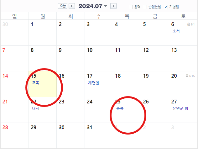 초복은 삼복 가운데 첫번째에 드는 복날로, 이 시기는 소서와 대서 사이로 되므로 더위가 본격적으로 오는 시기입니다